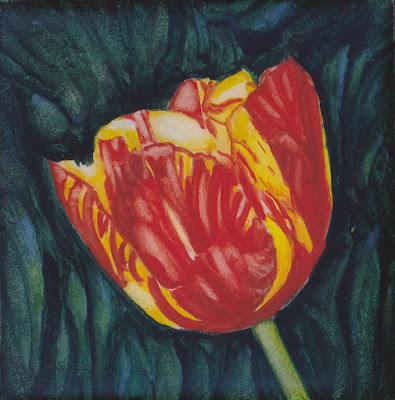 This original painting is on an 1/8" Ampersand Aquabord panel that I love more all the time because of the vivid colors and very special effects that can be achieved on it. In "Spring Beauty" I had a lot of fun creating depth and using negative painting techniques to hint at leaves in the background. I finished the painting with a varnish, then glossy resin-like coating that increases the depth and the shine. These miniatures do not need glass!!!